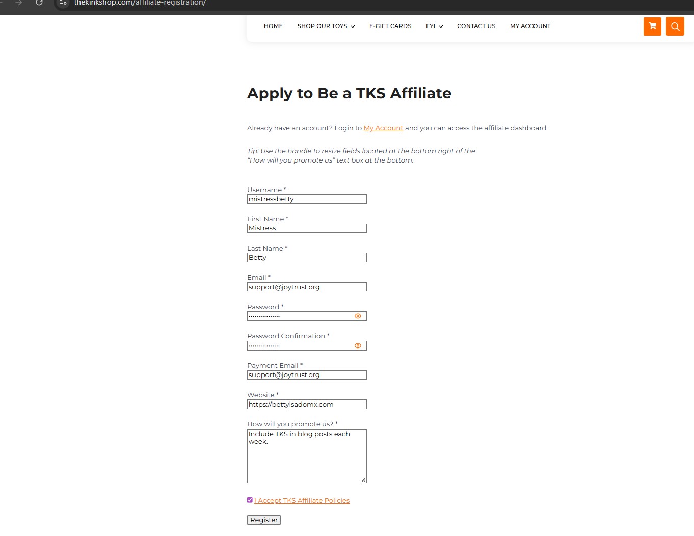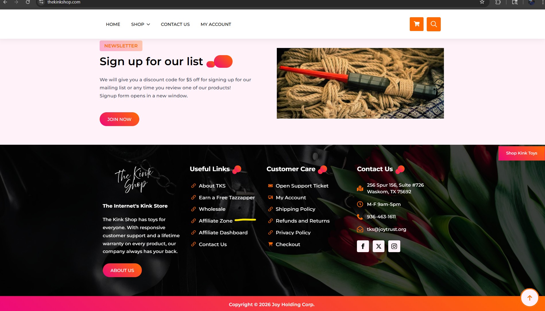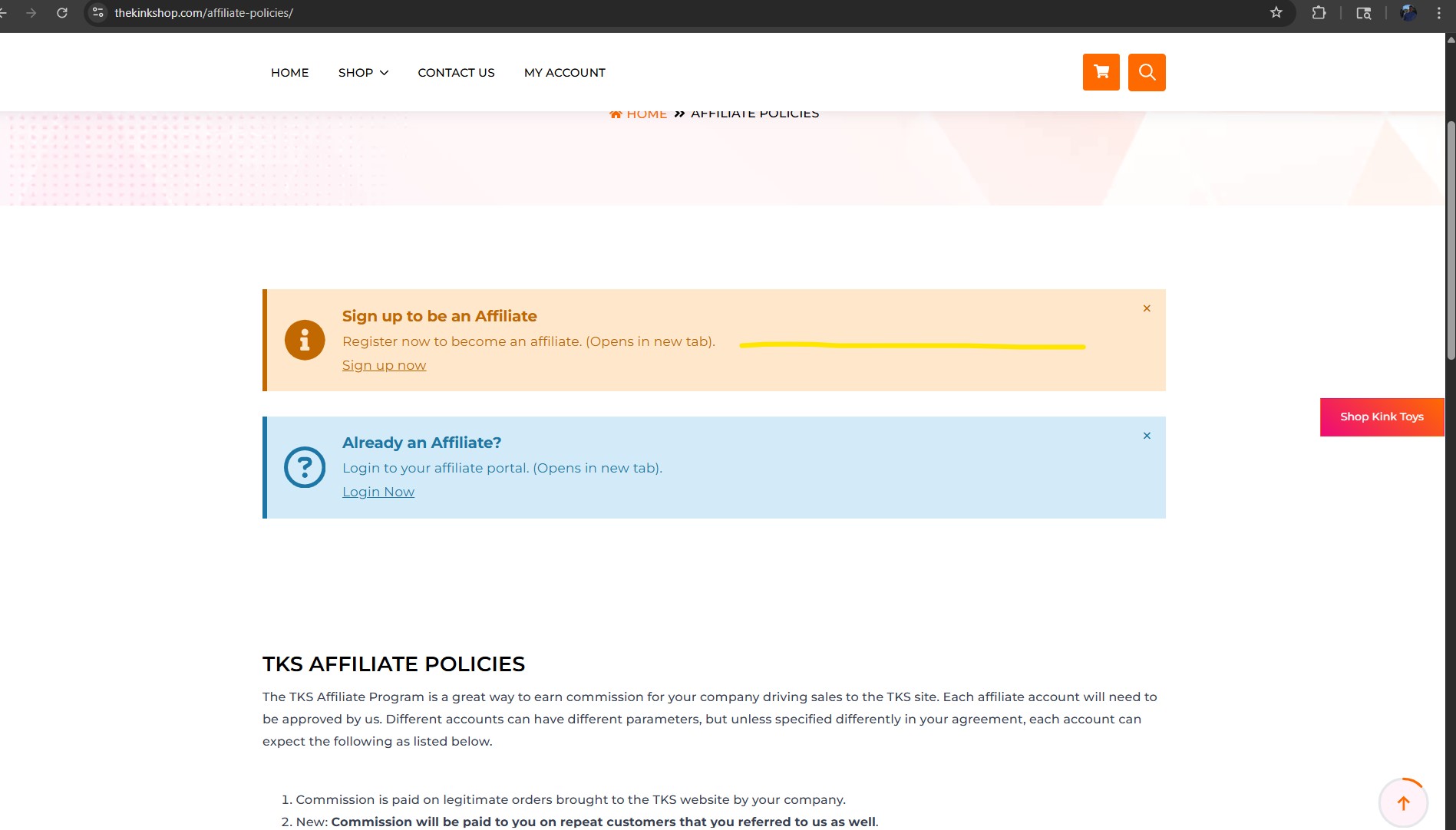 TheKinkShop.Com Affiliate Zone will take you to the signup page3. The affiliate zone will have all of our policies. Please read them. You are agreeing to these terms when signing up.