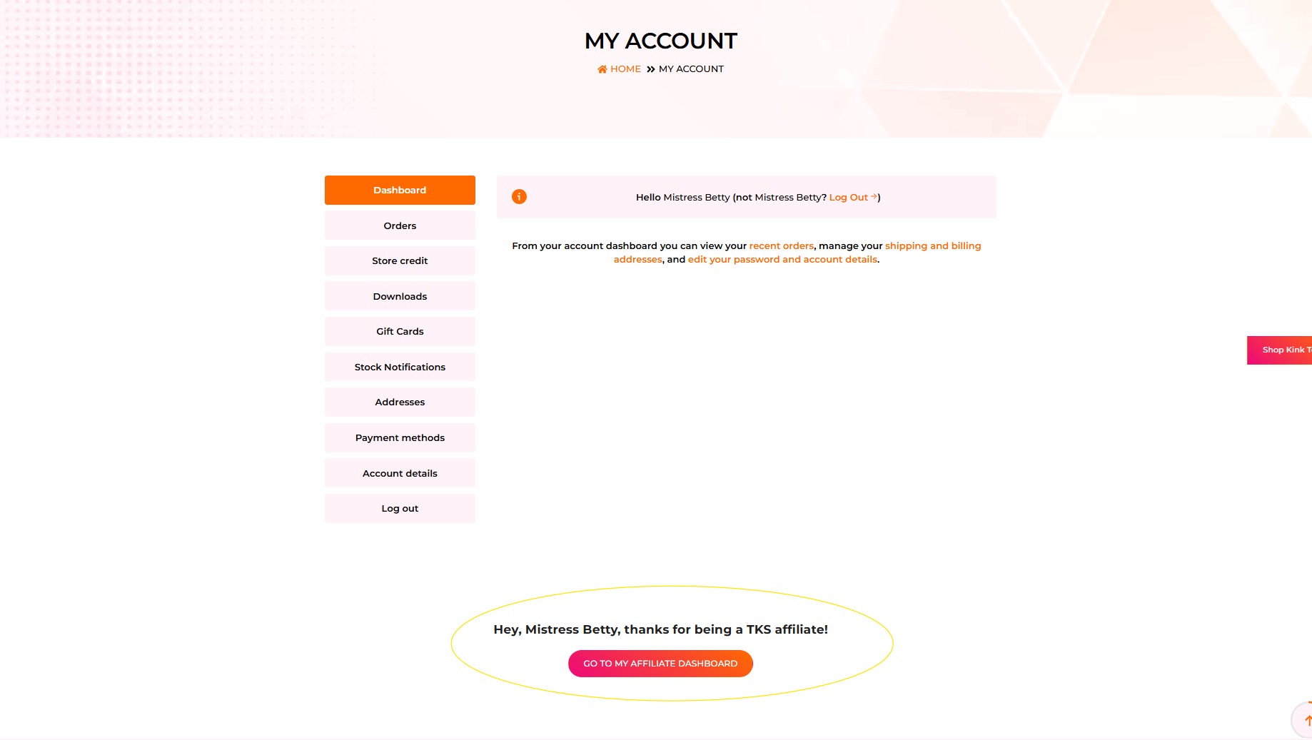 Once I am an approved TKS affiliate how do I login? 1. On https://thekinkshop.com/ simply click "My Account" in the header or in the footer of the site. The direct link for this area can be accessed here: https://thekinkshop.com/my-account/ 2. In the ...